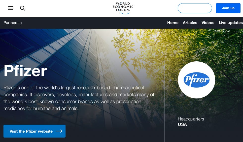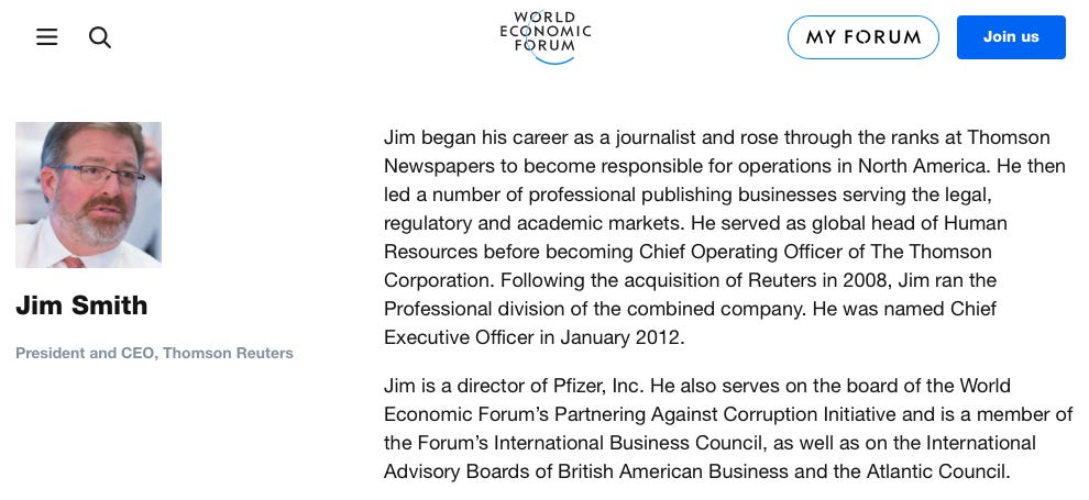 Coincidentally Smith also happens to be a member of the International Business Council of the World Economic Forum. That’s nearly a grand slam for James. Reuters, Pfizer & WEF. The only thing missing from his resume would seem to be a link to the Bill & Melinda Gates Foundation (BMGF).