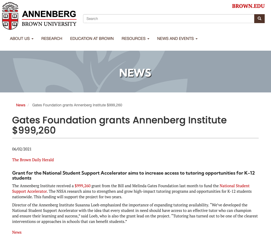 The Annenberg Institute is affiliated to Brown University which is separate to the public policy centre, it has also received grants from the Bill & Melinda Gates Foundation to the tune of $999,260 earlier this year.