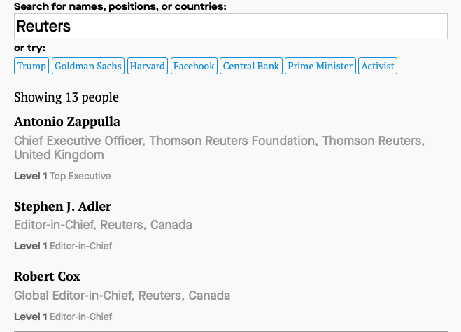 In 2020 Reuters had 13 journalists attending the World Economic Forum (WEF). This is the same fact checking company who fact checks BBC, ITV, Sky, Channel 4, DT, Guardian etc as well as all the content that goes on FB, Google, Twitter etc.